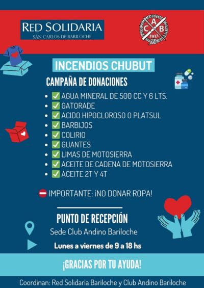 RED SOLIDARIA Y EL CLUB ANDINO BARILOCHE ORGANIZAN COLECTA PARA ASISTIR A BRIGADISTAS EN CHUBUT
