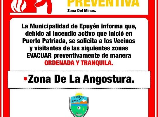 La Municipalidad señaló que la zona segura para quienes deban salir de la Angostura es el Gimnasio Municipal de Epuyén. Allí se está recibiendo a los evacuados y se coordinan las acciones de resguardo. En el mismo comunicado se agregó: “Por favor, tomen sus precauciones y diríjanse a áreas seguras”, Municipalidad de Epuyén.